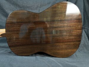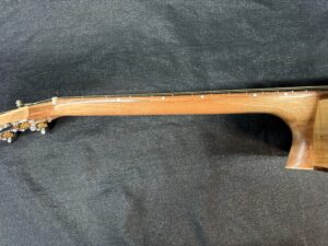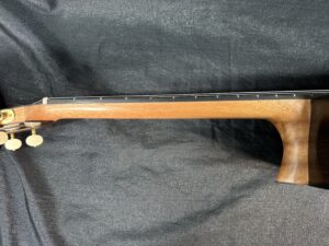 This maple is from the same tree as #274 and has more pronounced color variations. I combined it with Western Red Cedar which has a little mellower tone than Redwood, perhaps a touch softer in sound. The bindings are curly Koa, Spanish Cedar neck, Pau Ferro fingerboard and bridge, a tapered fingerboard so it is thinner at the sound hole end than the nut end allowing for lower saddle and string height over the body. Grover U98 tuners, and Oasis Southcoast 8200bl strings, DGBE. French polish shellac finish on the body for a glossy look, toned down to a satin on the neck for a smooth feel. Fingerboard width at the nut is 1.5″ or 38mm. Strings height is .5mm at the 1st fret and 2.5mm at the 12th. As you can see through the soundhole I accidentally numbered this with the previous instrument serial number and discovered it after the body was built, so I had to write over the 4 with a 5 on the neck, but the label inside has the correct serial number.