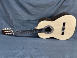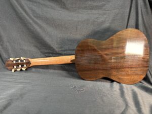 Sweet sounding cedar mellowed with walnut, combined with Galli professional series strings makes for a beautiful combination. Indian Rosewood fingerboard and bridge, walnut rosette, bone nut and saddle, Mother of Pearl fret dots, Grover U99 tuners, and a spanish cedar neck. Glossy French polish finish, dulled to satin on the neck for smooth feel and action.