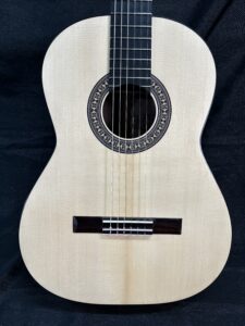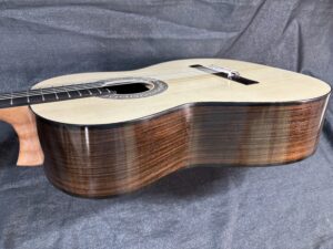 Spanish Cypress back and sides, European Spruce soundboard, Ebony fingerboard and bridge, bone nut and saddle, Der Jung tuners, Rosewood bindings, Spanish Cedar neck, Savarez Alliance Cantiga 510MR strings, removable golpeadores, and Crossrock tweed plywood case 620 series. Lighter in weight than #267. Very low action with the desired growl of the lower strings. Glossy French Polish soundboard and satin lacquer over the rest of the instrument.