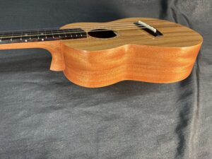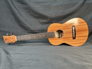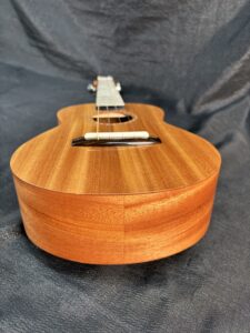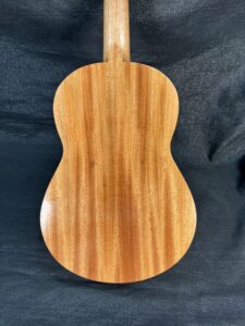Khaya is also known as African Mahogany, and is the same genetic family as Mahogany. This wood was grown in Hawaii and has a wonderful clean sound. Made with a hand carved Spanish Cedar neck, Indian Rosewood fingerboard and bridge, bone nut and saddle, Mother of Pearl fret dots, Grover U98 tuners with an 18:1 turning ratio, and Oasis warm low G strings with a wound G string. The width of the fingerboard at the nut is 1 3/8″, the traditional size. It is finished with French Polish shellac. Select whether you want with or without a case, and which case color you prefer, then click buy now.